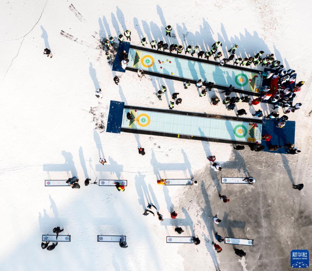 這是2月7日拍攝的旱地冰壺和迷你冰壺的活動(dòng)現場(chǎng)(無(wú)人機照片)。