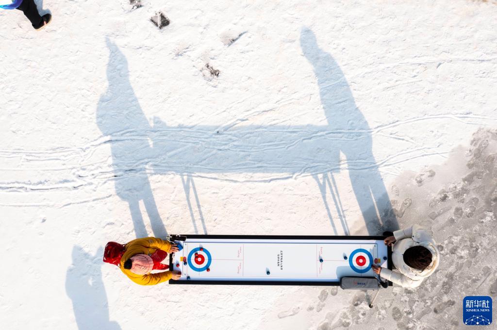 2月7日,人們在活動(dòng)現場(chǎng)體驗迷你冰壺項目(無(wú)人機照片)。