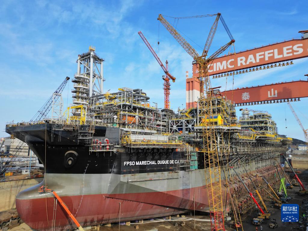 這是2月7日在中集來(lái)福士山東煙臺建造基地拍攝的建造中的大型浮式生產(chǎn)儲卸油船(無(wú)人機照片)。