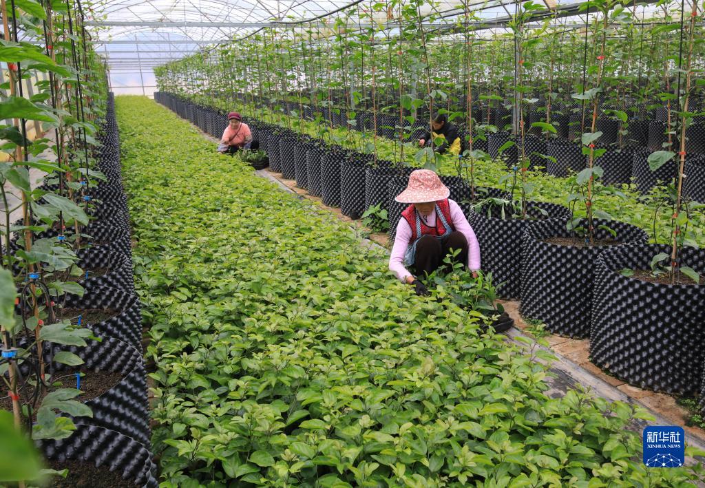 2月7日,工人在貴州省黔東南苗族侗族自治州從江縣貫洞鎮一家種苗繁育基地管護百香果秧苗。