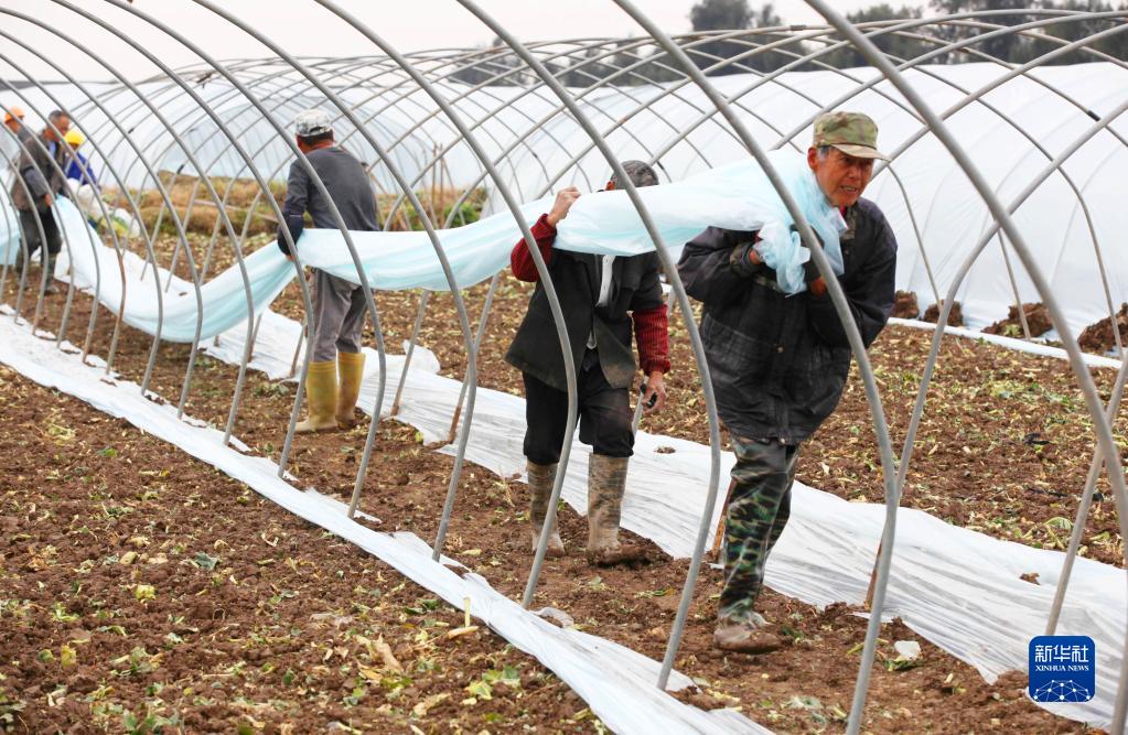 2月7日,在浙江省溫嶺市東浦新塘,西瓜種植戶(hù)在覆蓋西瓜大棚塑料薄膜,準備種植新一季西瓜。