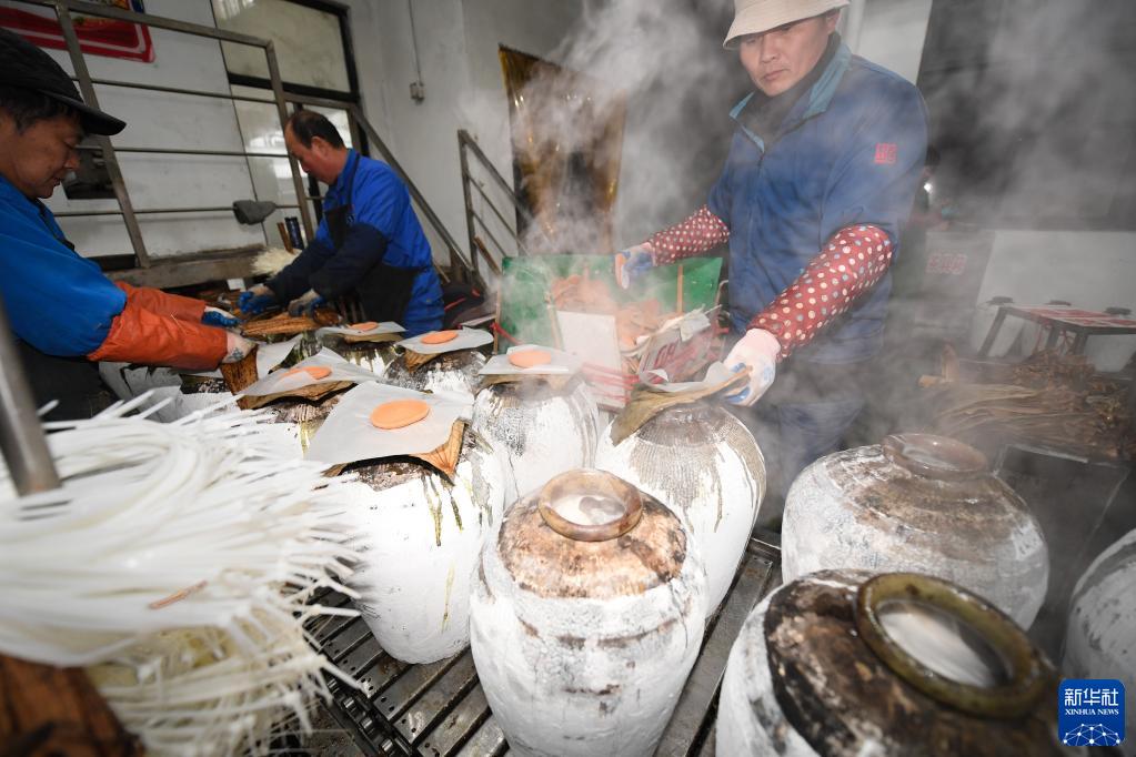 2月7日,在位于紹興市越城區的古越龍山釀酒一廠(chǎng),工作人員將完成春榨的酒用傳統的荷葉、竹殼封壇。新華社記者 翁忻旸 攝