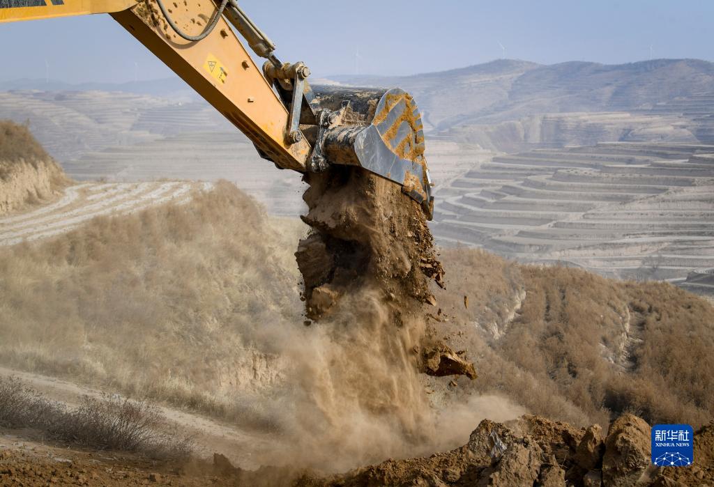 2月7日,工人操作挖掘機在寧夏固原市西吉縣硝河鄉蘇溝村平整土地。