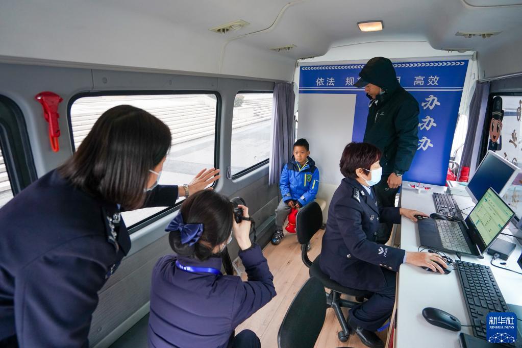 2月7日,南京市公安局建鄴分局政務(wù)服務(wù)管理大隊民警在綜合服務(wù)流動(dòng)車(chē)上為一名兒童采集身份證照片。