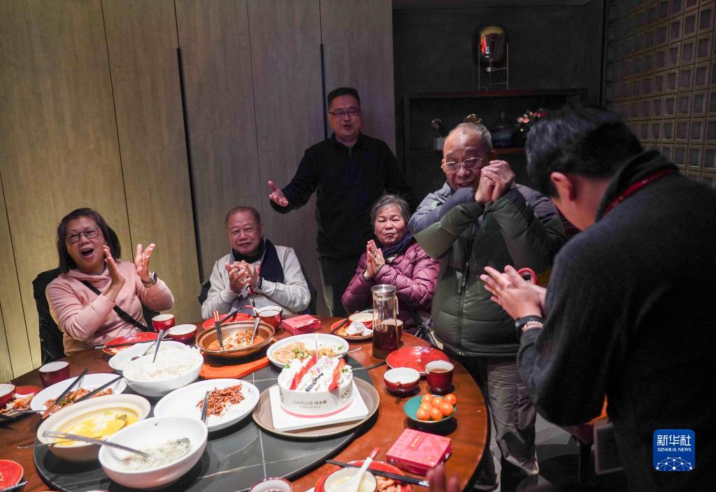 2月7日,當天是香港游客李國麟(右二)69歲生日,旅行社為他準備了生日蛋糕。