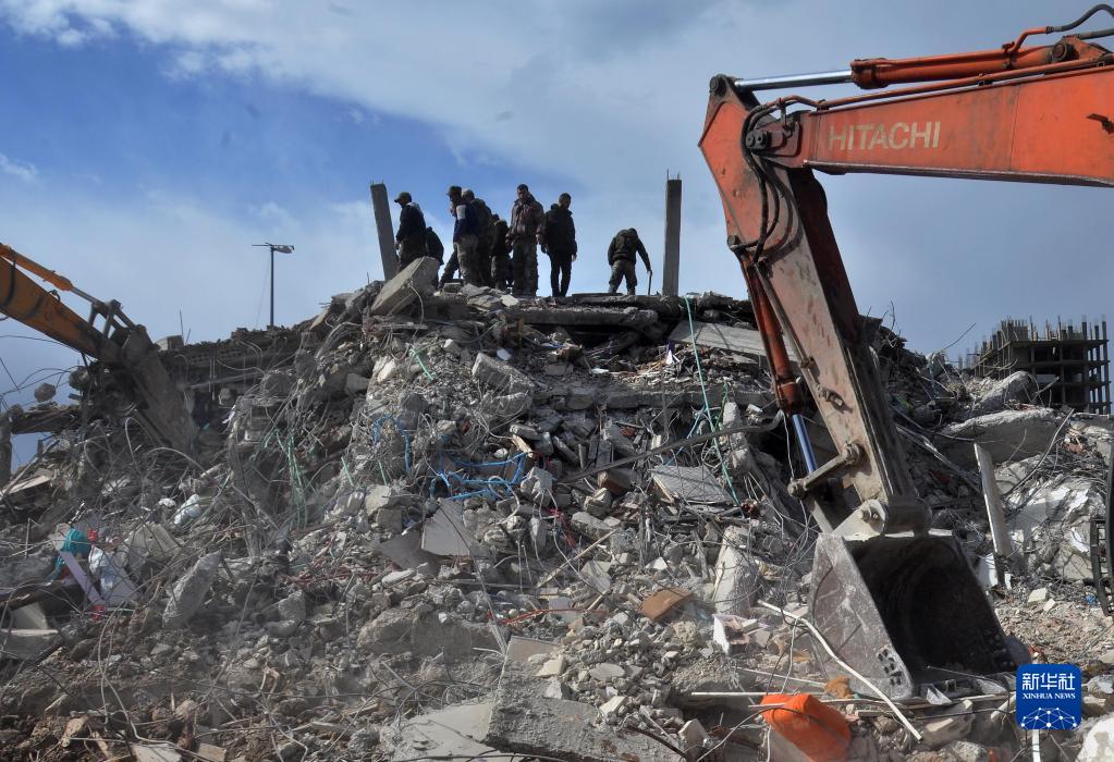 2月7日,人們在敘利亞拉塔基亞省的一處地震廢墟參與搜救。