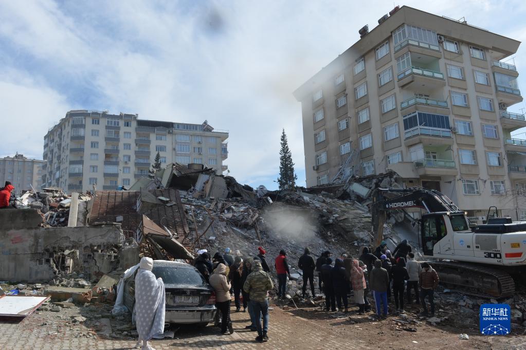 2月7日,人們聚集在土耳其南部卡赫拉曼馬拉什市一處地震廢墟。