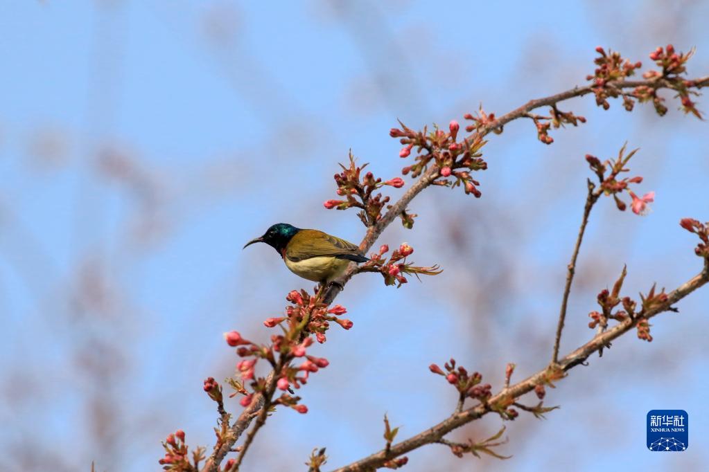 2月6日,在湖南省湘西土家族苗族自治州龍山縣華塘街道象鼻社區,一只鳥(niǎo)兒在花枝上停留。