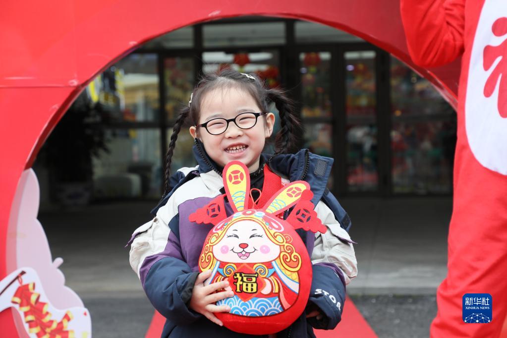 2月8日,浙江省寧波市濱海新城幼兒園開(kāi)學(xué),一名小朋友收到吉祥禮物。