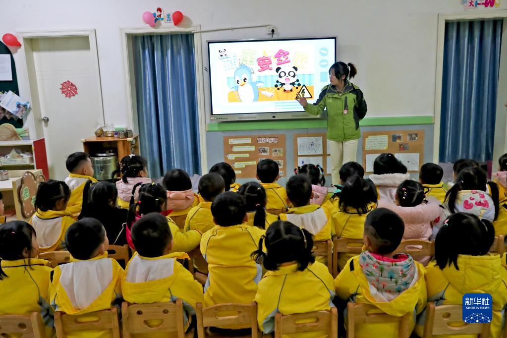 2月8日,在四川省廣安市廣安區兩路口幼兒園,教師給小朋友講解安全用電常識。