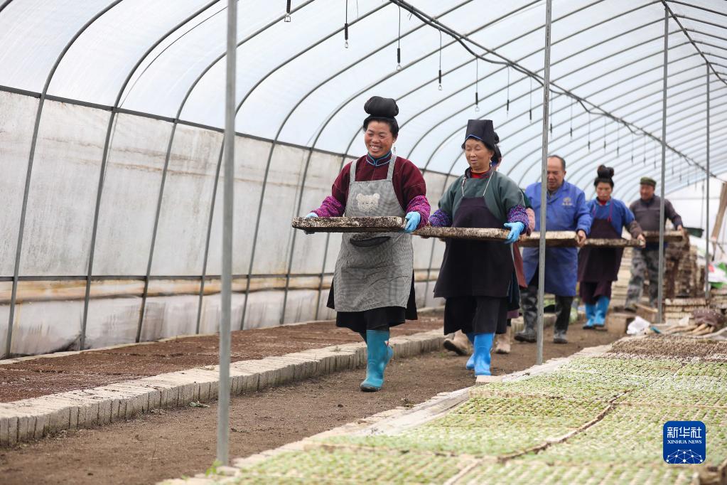 2月8日,在貴州省黔東南苗族侗族自治州丹寨縣興仁鎮臺辰村辣椒育苗基地,村民將穴盤(pán)轉移至大棚里。