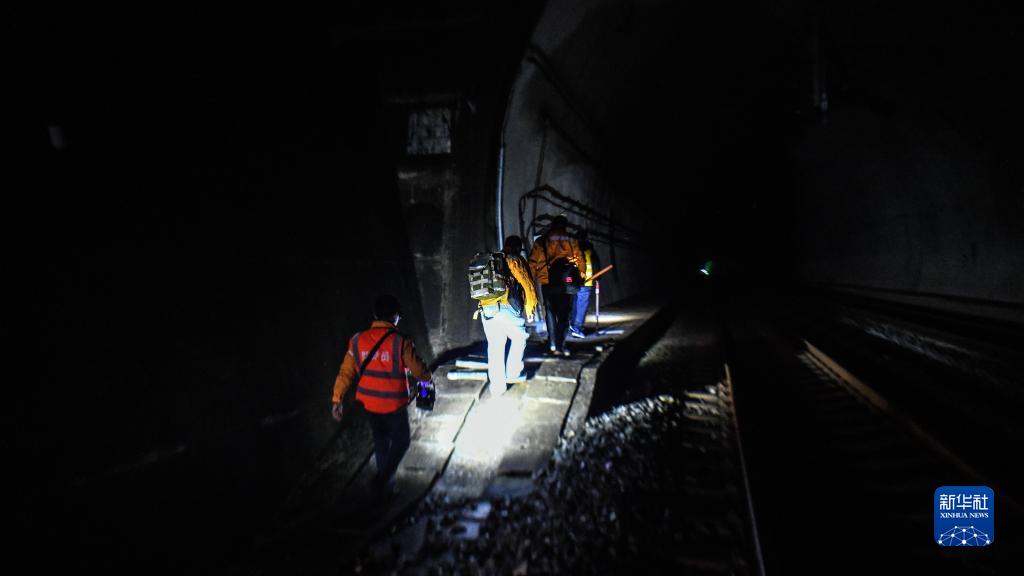 2月8日,欽州電務(wù)段欽州高鐵通信車(chē)間的通信工進(jìn)入高鐵隧道巡查。