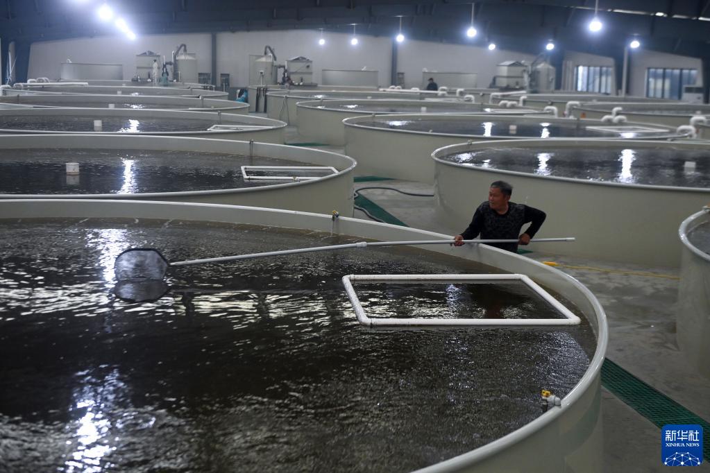 2月8日,在位于湖州市織里鎮的漁大哥水產(chǎn)養殖專(zhuān)業(yè)合作社育苗室內,工作人員在給魚(yú)苗喂食。