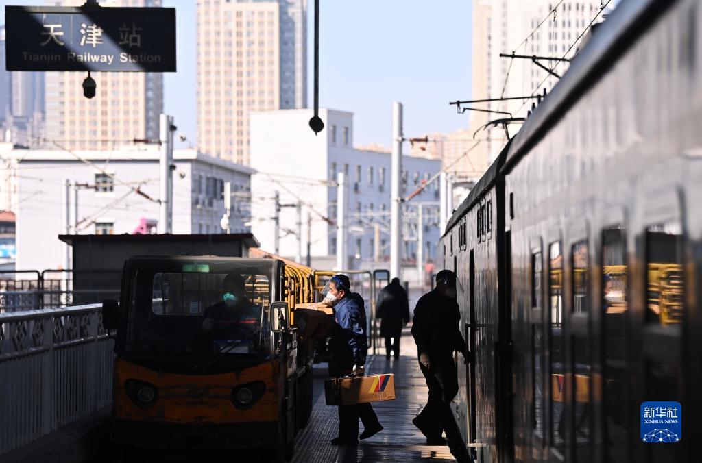2月8日,在天津站3站臺,工作人員從列車(chē)上卸貨。