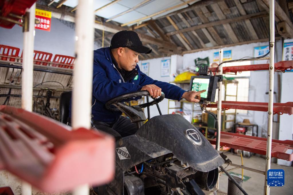2月8日,在鼎城區國家現代農業(yè)產(chǎn)業(yè)園一處農機維保站,工作人員在調試一臺無(wú)人駕駛插秧機。