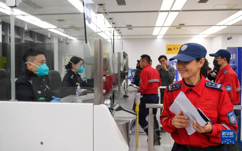 2月8日,在深圳灣口岸邊檢查驗臺,深圳公益救援隊先遣隊隊長(cháng)陳媛(右)完成查驗準備出發(fā)前往香港國際機場(chǎng)。