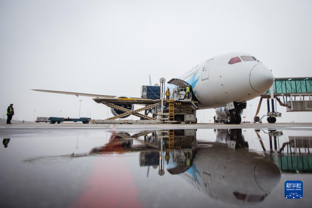 2月8日,機場(chǎng)工作人員將救援物資運入飛機貨倉。
