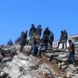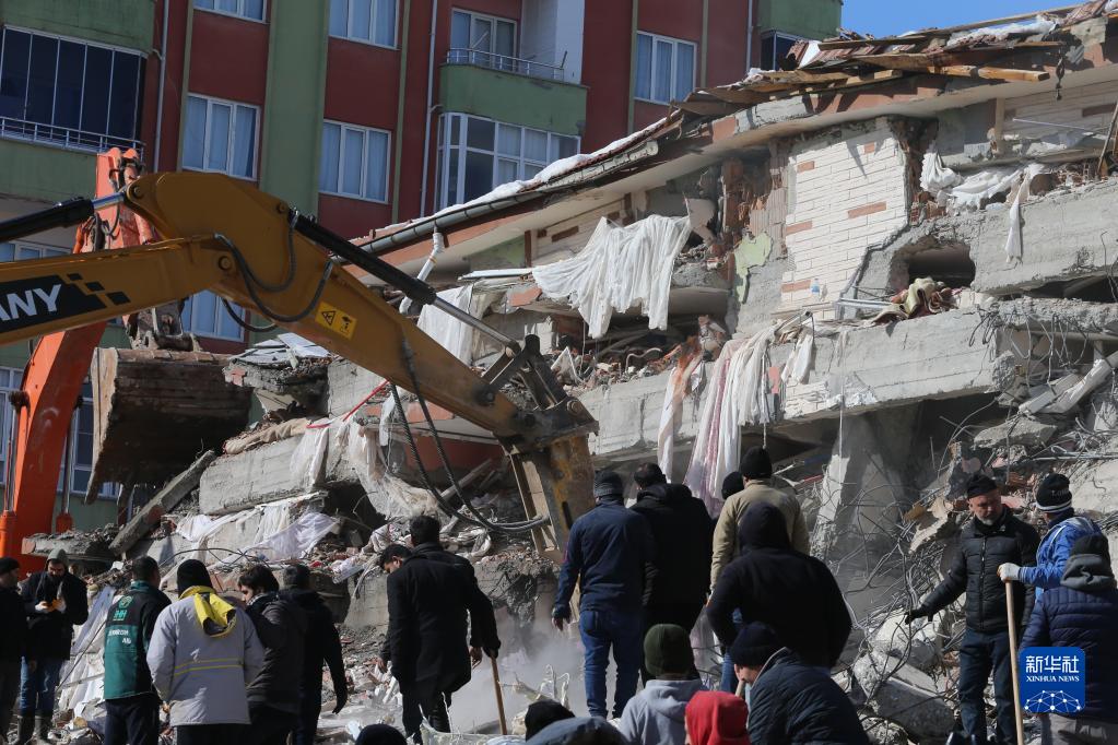 2月8日,在土耳其阿德亞曼省貝斯尼,救援人員在地震廢墟搜救。