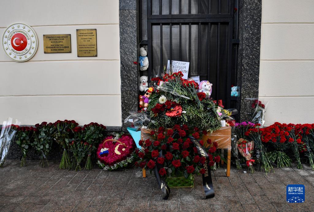 這是2月8日在位于莫斯科的土耳其駐俄羅斯大使館外拍攝的為悼念地震遇難者擺放的鮮花。