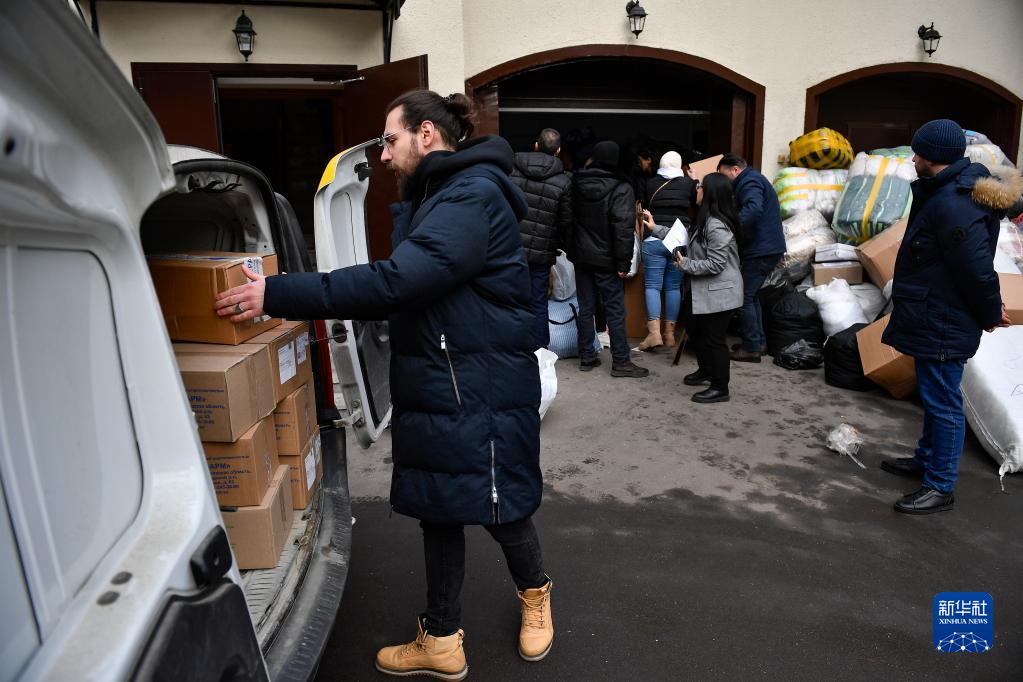 2月8日,在位于莫斯科的敘利亞駐俄羅斯大使館,一名男子將救援物資裝車(chē)。