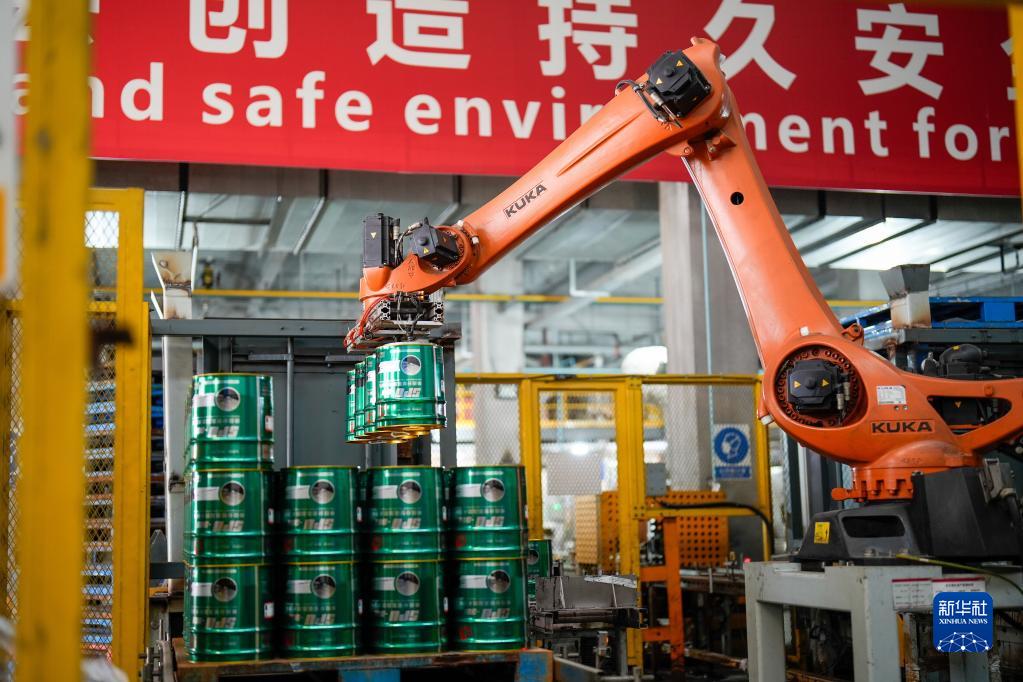2月2日,在位于河北省唐山市豐南區的唐山東方雨虹防水技術(shù)有限責任公司,機械手臂在運輸產(chǎn)品。