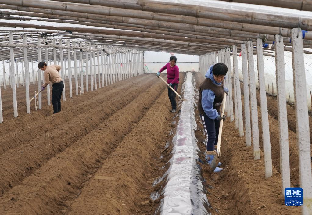 2月8日,河北省秦皇島市昌黎縣馬坨店鄉東趙莊村的農民在大棚內給剛播種的馬鈴薯覆膜。