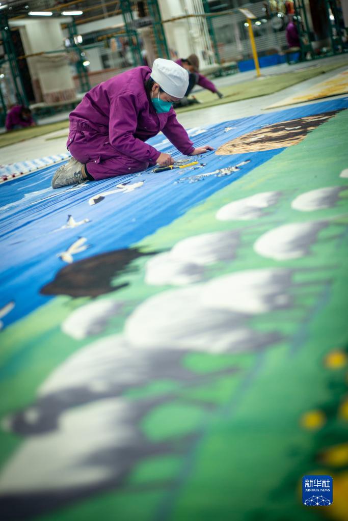 操作工在青海省西寧市圣源地毯集團有限公司生產(chǎn)車(chē)間檢查毯面、拔花刺(2月4日攝)。