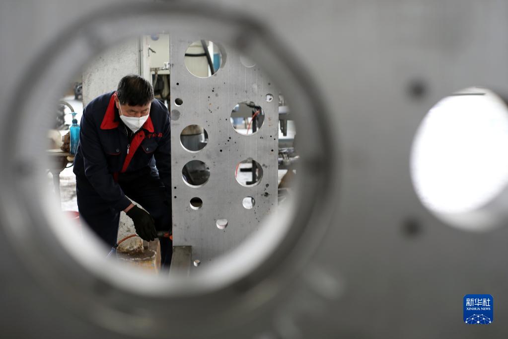 2月9日,在滄州市東光縣一紙箱機械公司,工作人員在組裝紙箱包裝全自動(dòng)生產(chǎn)線(xiàn)橫切機設備。