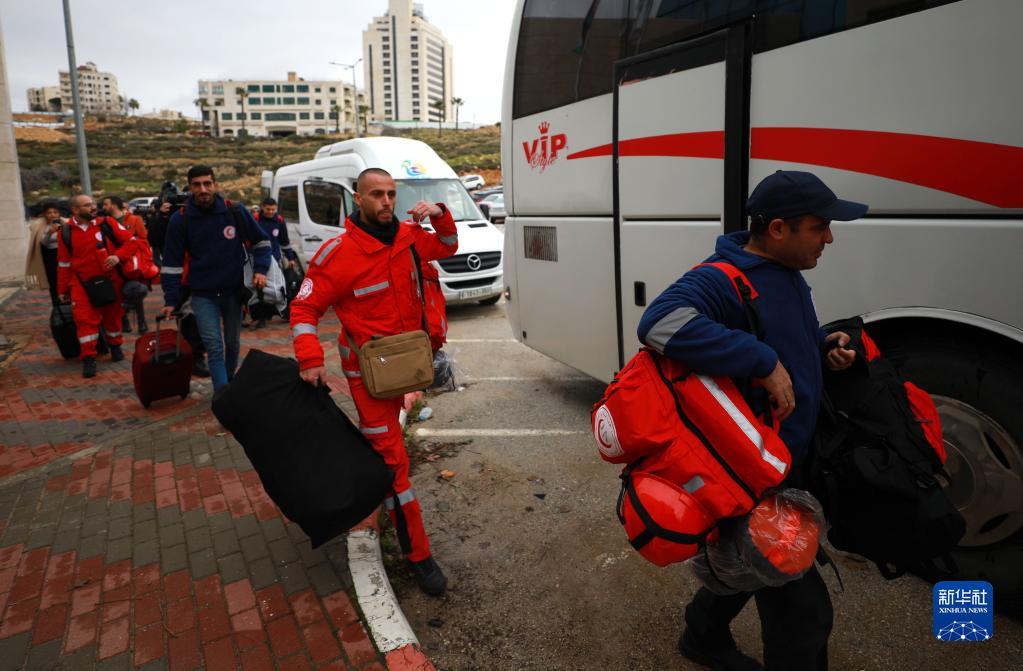 2月9日,在約旦河西岸城市拉姆安拉,巴勒斯坦救援隊隊員準備啟程奔赴震區。