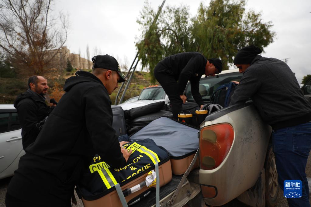 2月9日,在約旦河西岸城市拉姆安拉,巴勒斯坦救援隊隊員將救援物資裝車(chē)。