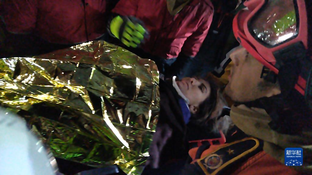 2月9日晚,在土耳其哈塔伊省安塔基亞市,中國救援隊與土耳其救援隊合力營(yíng)救出的幸存者被抬出廢墟。