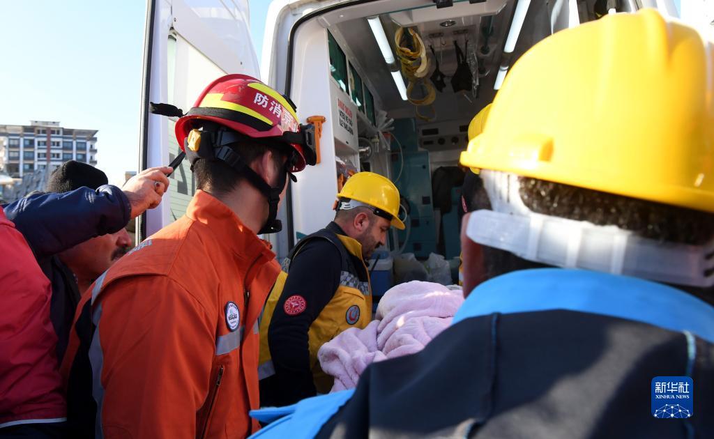2月9日,在土耳其哈塔伊省安塔基亞市,中國救援隊與土耳其救援隊轉移一名救出的女性幸存者。