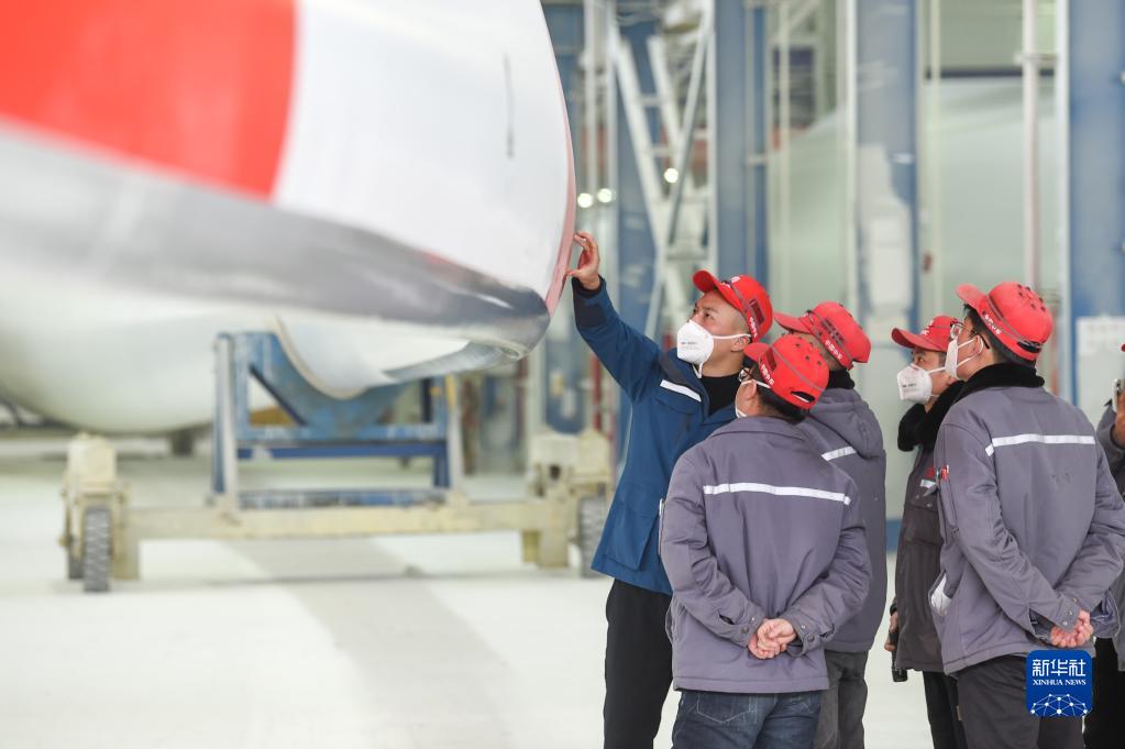 2月9日,工人在株洲時(shí)代新材料科技股份有限公司蒙西分公司風(fēng)力發(fā)電葉片生產(chǎn)車(chē)間內檢查風(fēng)力發(fā)電葉片。