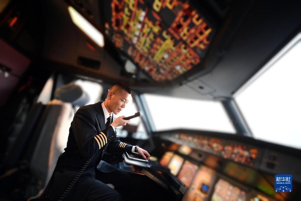 馬保利在飛機駕駛艙內進(jìn)行機長(cháng)廣播(2月4日攝)(駕駛艙進(jìn)行了虛化處理)。