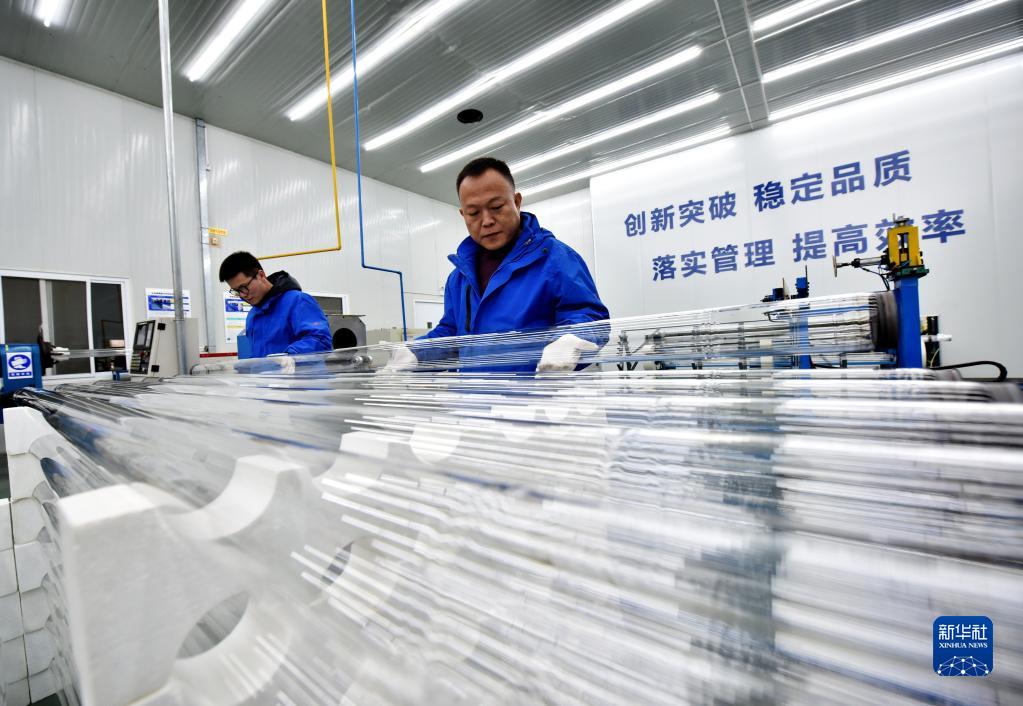 河北威縣高新區一家新能源科技有限公司工人在檢驗太陽(yáng)能集熱管(2月3日攝)。