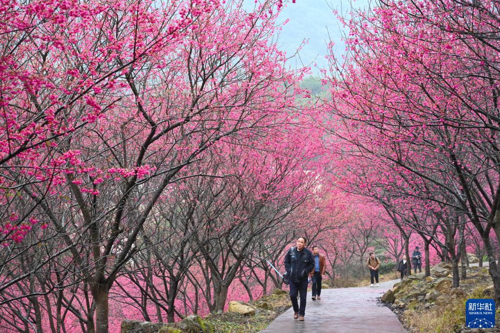 2月10日,游客在靈石山國家森林公園賞櫻。