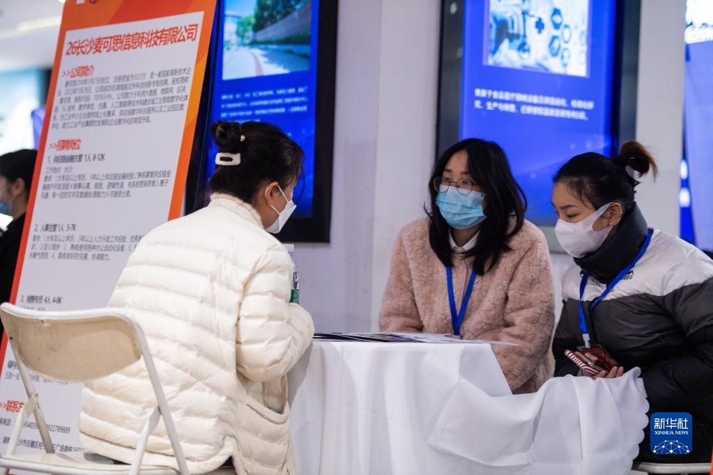 2月10日,在長(cháng)沙麓谷科技創(chuàng )新創(chuàng )業(yè)園,招聘人員與求職者溝通。