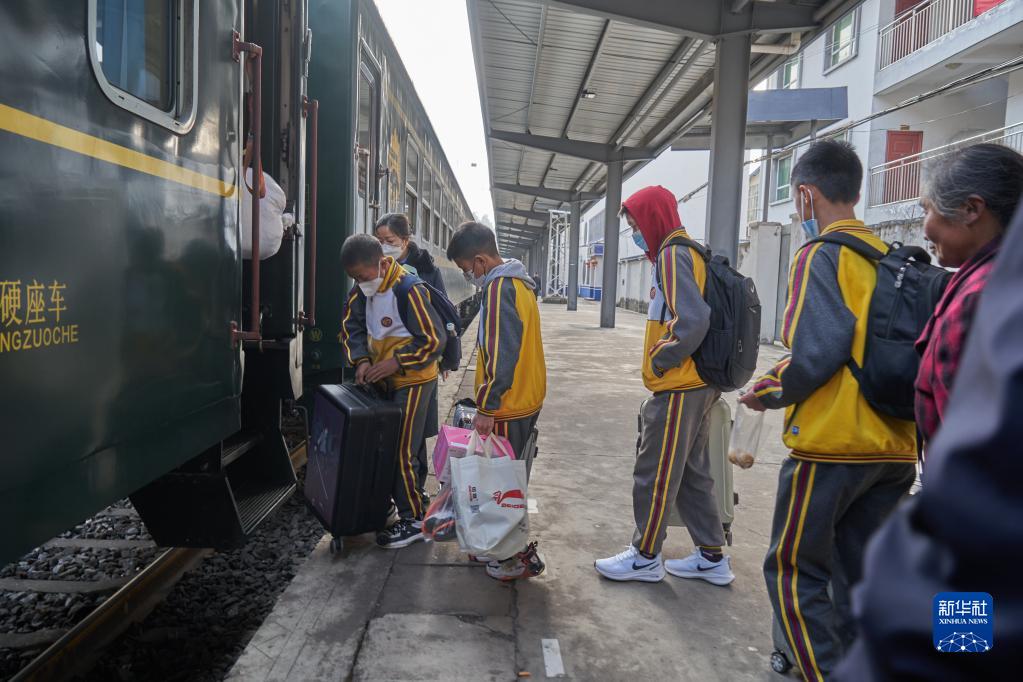 2月9日,在四川涼山州喜德縣火車(chē)站,學(xué)生們登上5633次列車(chē)。