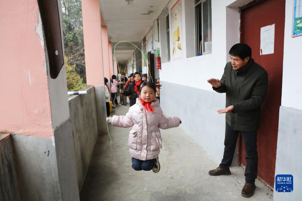 在楠木鄉官溪小學(xué),賴(lài)小田利用課間帶領(lǐng)孩子們跳繩(2月7日攝)。