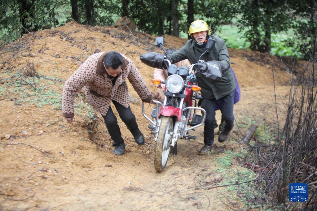 在前往家訪(fǎng)的路上,村民幫賴(lài)小田推車(chē)上一段陡坡(2月9日攝)。
