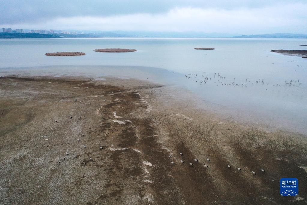 2月9日,候鳥(niǎo)在貴州草海覓食(無(wú)人機照片)。