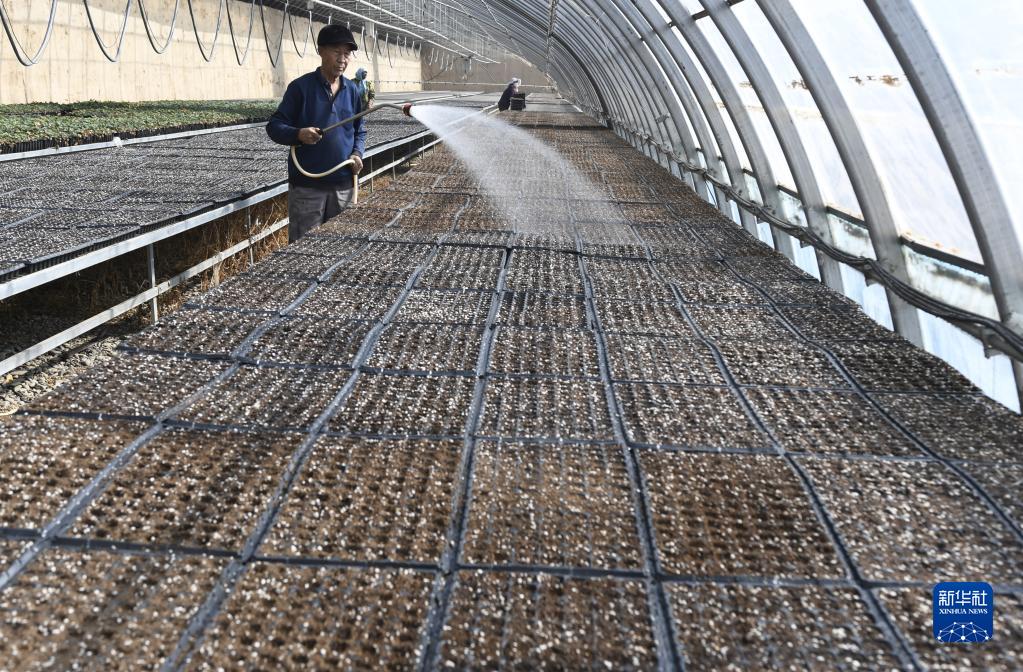 2月10日,在甘肅省永靖縣三塬鎮一家種苗培育基地,農民在溫棚內澆水。