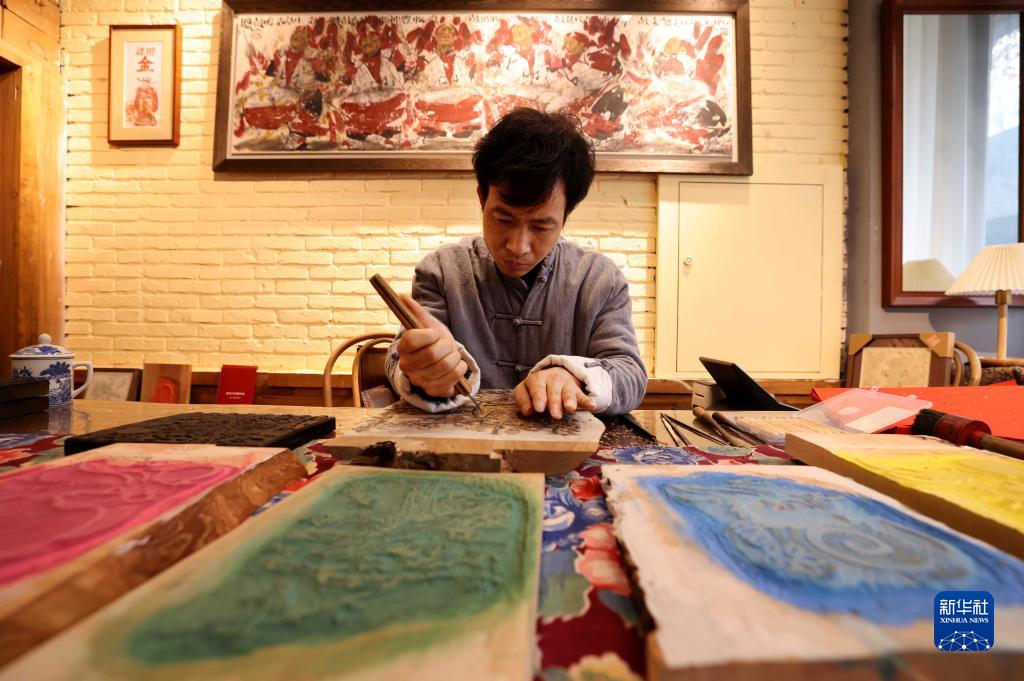2月10日,在童壽記木版年畫(huà)工作室,童敏在進(jìn)行年畫(huà)刻版。