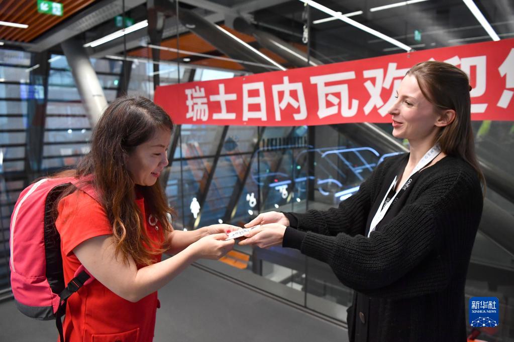 2月9日,在瑞士日內瓦國際機場(chǎng),中國旅客接受日內瓦旅游局工作人員遞上的瑞士特色紀念品。