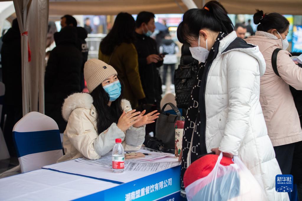 2月11日,在長(cháng)沙市天心區黃興南路步行街,招聘人員(左)在與求職者溝通。