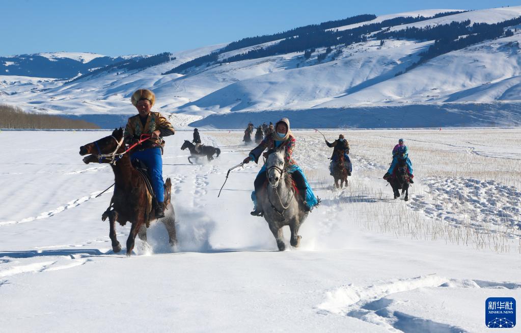 在新疆昭蘇縣薩爾闊布鄉一處雪原上,當地農牧民進(jìn)行“姑娘追”活動(dòng)(2022年12月21日攝)?!肮媚镒贰笔枪_克族的傳統馬上體育運動(dòng)。入冬以來(lái),昭蘇縣各族農牧民開(kāi)展豐富多彩的民間文化體育活動(dòng),豐富冬閑時(shí)節生活。新華社發(fā)(李文武 攝)