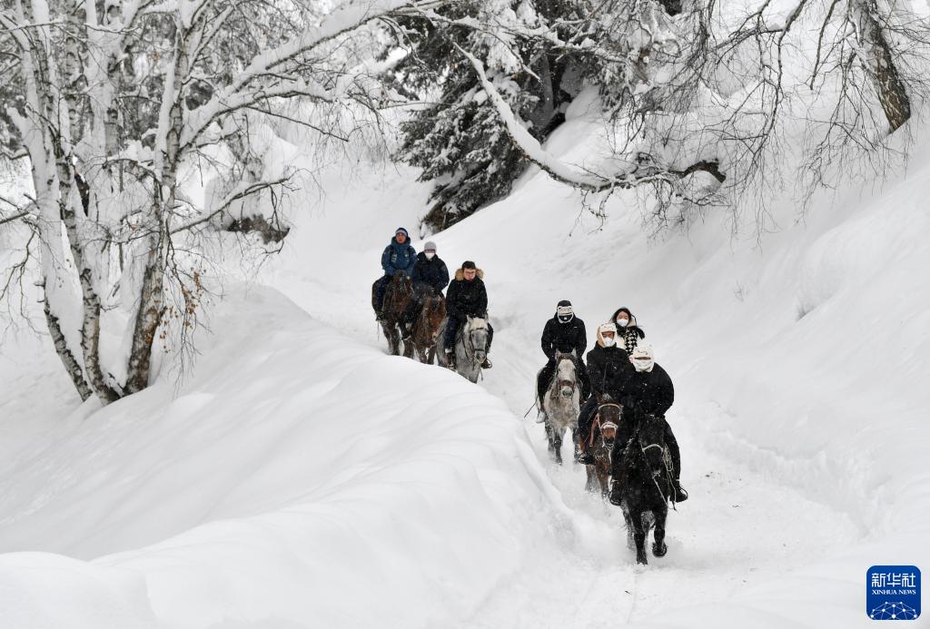 游客在新疆阿勒泰地區騎馬賞雪(2023年1月7日攝)。新華社記者 胡虎虎 攝