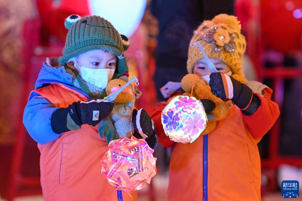 烏魯木齊七一東街廣場(chǎng),小朋友提著(zhù)花燈游玩(2023年1月22日攝)。新華社記者 丁磊 攝