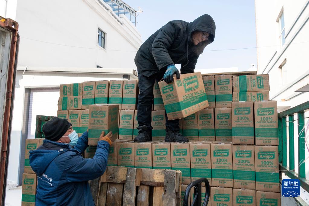 2月11日,工人在中國(黑龍江)自由貿易試驗區黑河片區搬運進(jìn)口貨物。