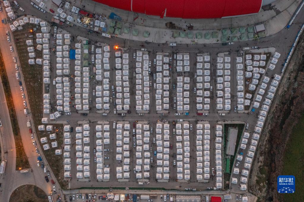 這是2月11日在土耳其哈塔伊省安塔基亞市用無(wú)人機航拍的臨時(shí)搭建的帳篷。